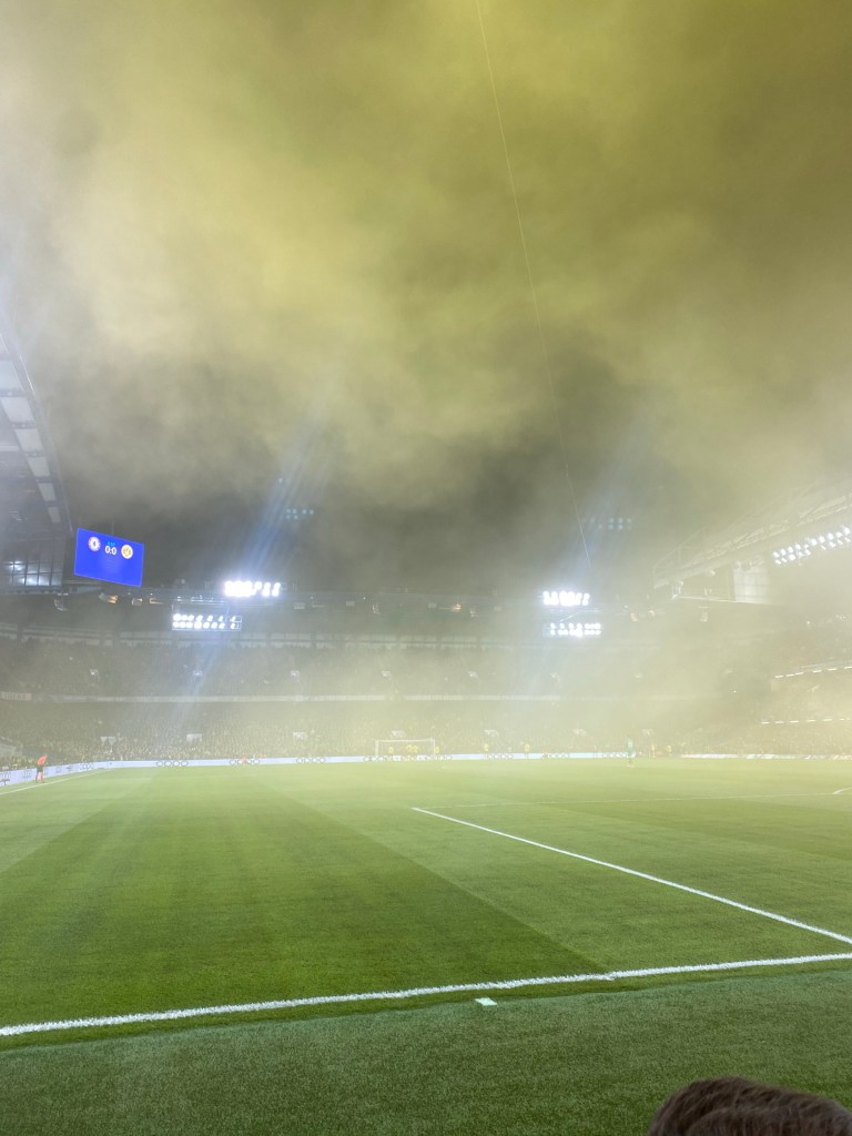 Few were positioned well to see the first few minutes of the match itself and I can’t help but be impressed by the sheer number of flares that the visiting Germans were able to sneak into our away end. Despite nobody being able to see much more of than 20 yards around them, kick off was somehow allowed to go ahead as planned with the only delay being from a previous blocking of team buses.